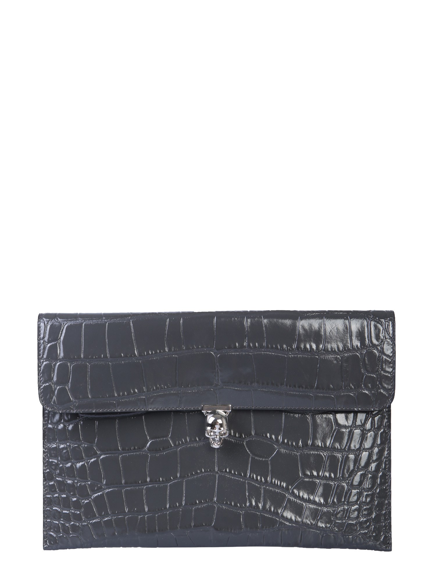 turnlock metal skull closure with swarovski set double leather lining dimensions: 19 cm x 28 cm x 0.5 cm 100% calf leather made in italy